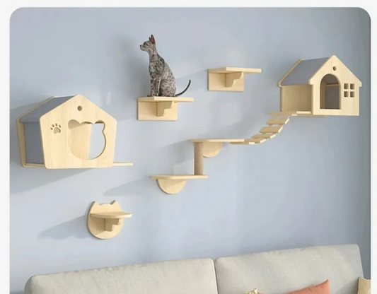 Wandmontiertes Katzenklettergerüst aus Holz – mit Kratzbereich und Nest
