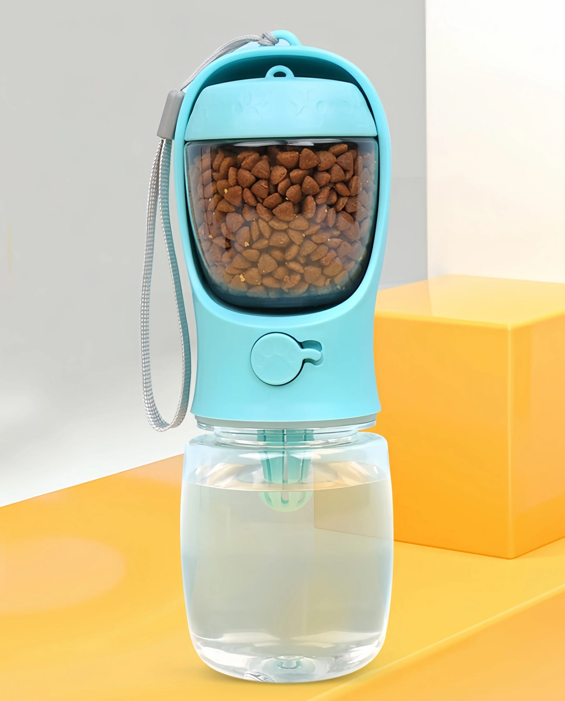 💧 2-in-1 Design – Wasser- und Futterfach in einer Flasche, ideal für unterwegs.