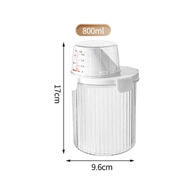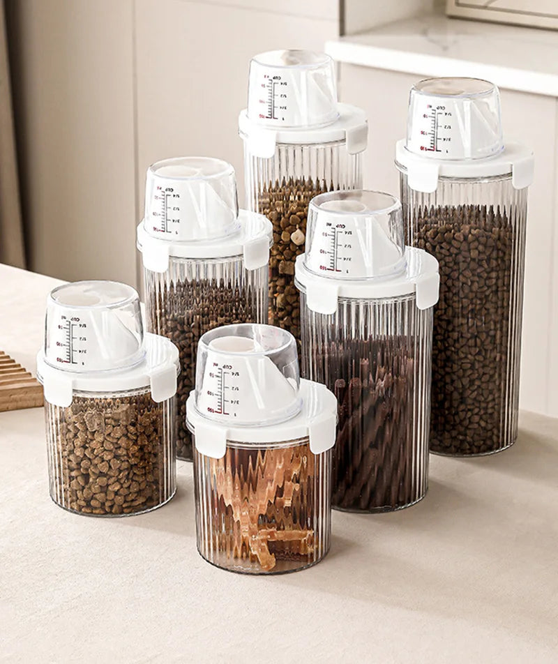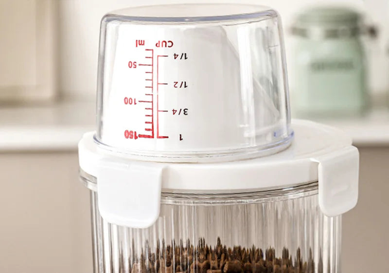 Dank des transparenten Designs siehst du auf einen Blick, wie viel Futter noch übrig ist, während der praktische Deckel mit Messskala dafür sorgt, dass du immer die richtige Portion abmessen kannst.