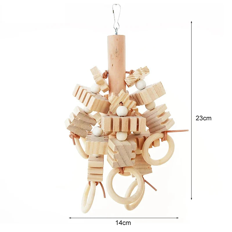 Dieses Holzspielzeug ist darauf ausgelegt, den Instinkt Ihres Papageien zum Kauen und Zerren zu befriedigen, wodurch der Schnabel kurz und gesund bleibt. Es bietet zudem mentale Stimulation, reduziert Langeweile und verhindert destruktives Verhalten.
