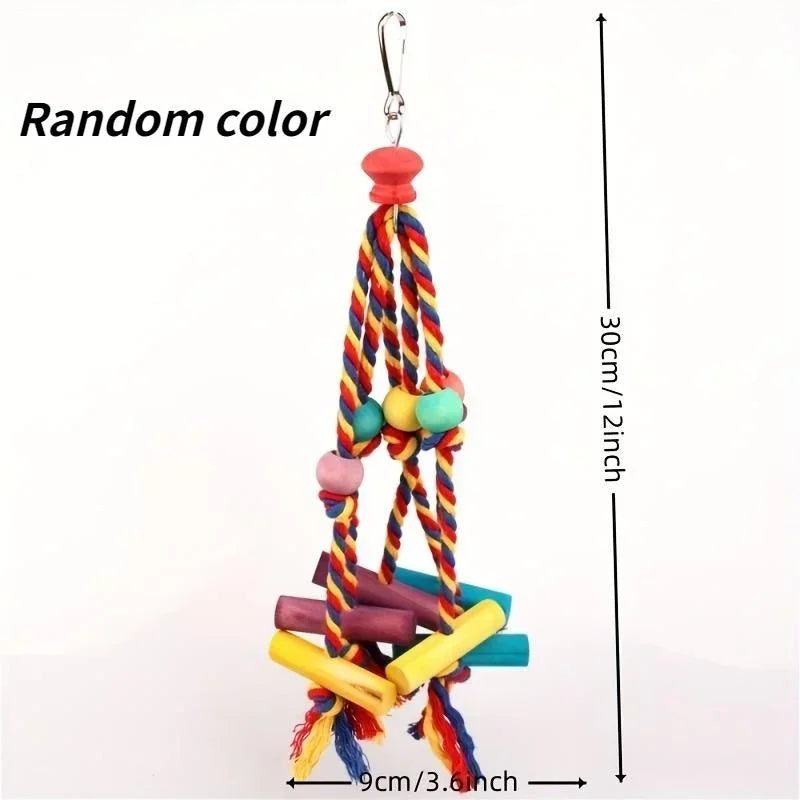 Halten Sie Ihre gefiederten Freunde aktiv und beschäftigt mit diesem farbenfrohen Vogelspielzeug aus Baumwollseil, Perlen und Holzblöcken. Dieses multifunktionale Spielzeug wurde speziell für kleine und mittelgroße Vögel entwickelt und fördert sowohl körperliche Bewegung als auch geistige Stimulation. Hergestellt aus sicheren, vogelsicheren Materialien – perfekt zum Kauen, Klettern und Spielen