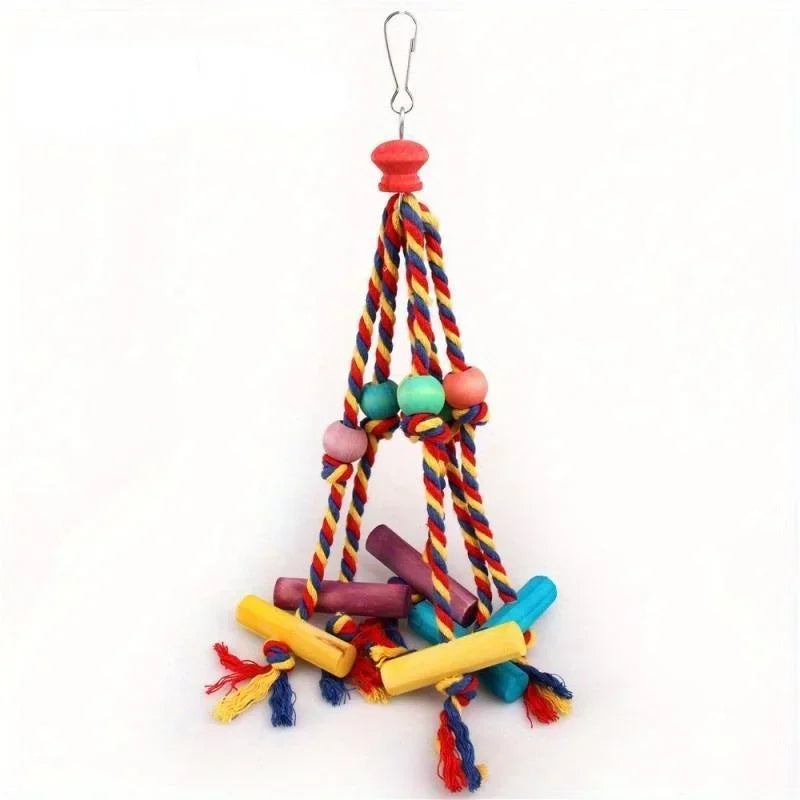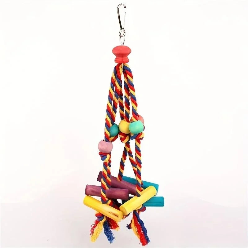 Dieses Vogelspielzeug kombiniert weiche Baumwollseile, farbenfrohe Kunststoffperlen und Holzblöcke, um Ihrem Vogel verschiedene Texturen zum Erkunden zu bieten. Ideal zum Kauen, Klettern und Schaukeln – sorgt für stundenlangen Spielspaß.